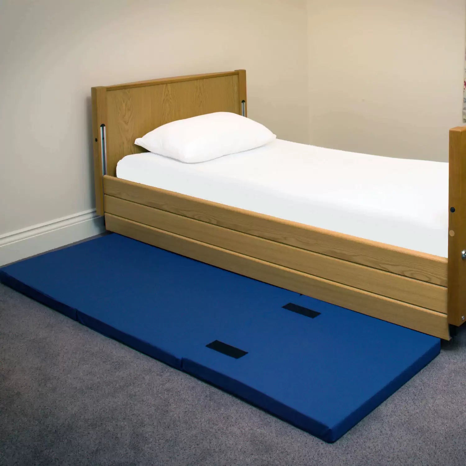 Crafted for use in care homes or residential environments that care for elderly patients, choose this high-quality Fall-Out Mat 60 x 190 x 7cm today. Suitable for use alongside low level beds, this high density foam filled mat provides protective cushioning should your patient experience a fall from their bed. Absorbing the impact of drops and reducing the risk of serious injury, the mat stretches the full length of a standard single bed while being crafted from a wipe clean and breathable material. Simply sanitise this fall-out mat with disinfectant wipes or spray to ensure the most hygienic option for your patients with this handy fall-out mat that folds up compactly for storage. Finally, the convenience of your carers is taking into consideration with the durable carry straps that come as standard.