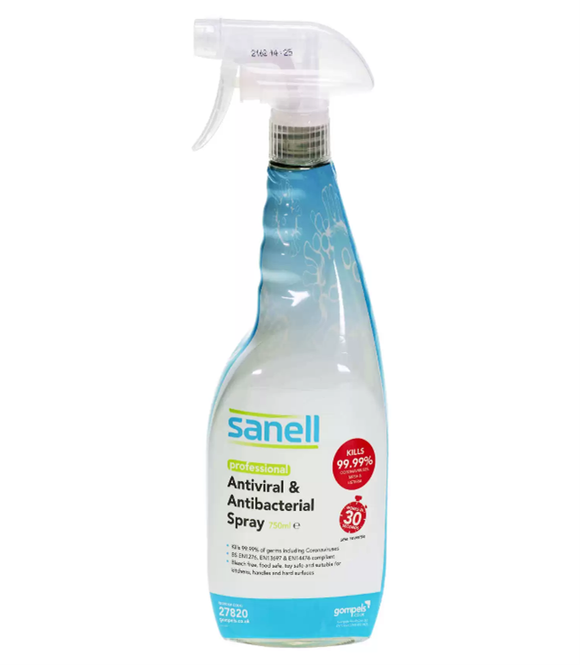 Product Description: Sanell's ready-to-use Antiviral Surface Spray is specially formulated to combat a wide range of bacteria and viruses, including coronaviruses. This fast-acting spray is highly effective, working on most non-porous surfaces in just 30 seconds. It is bleach-free and safe for use around food and children's toys, making it ideal for everyday environments.