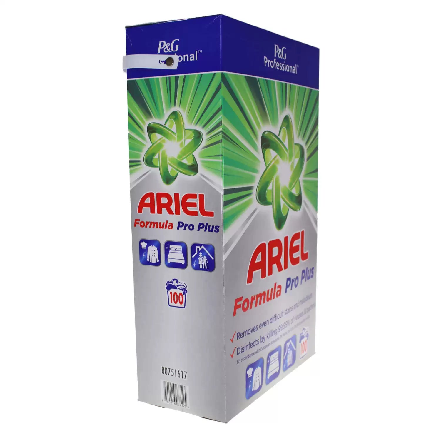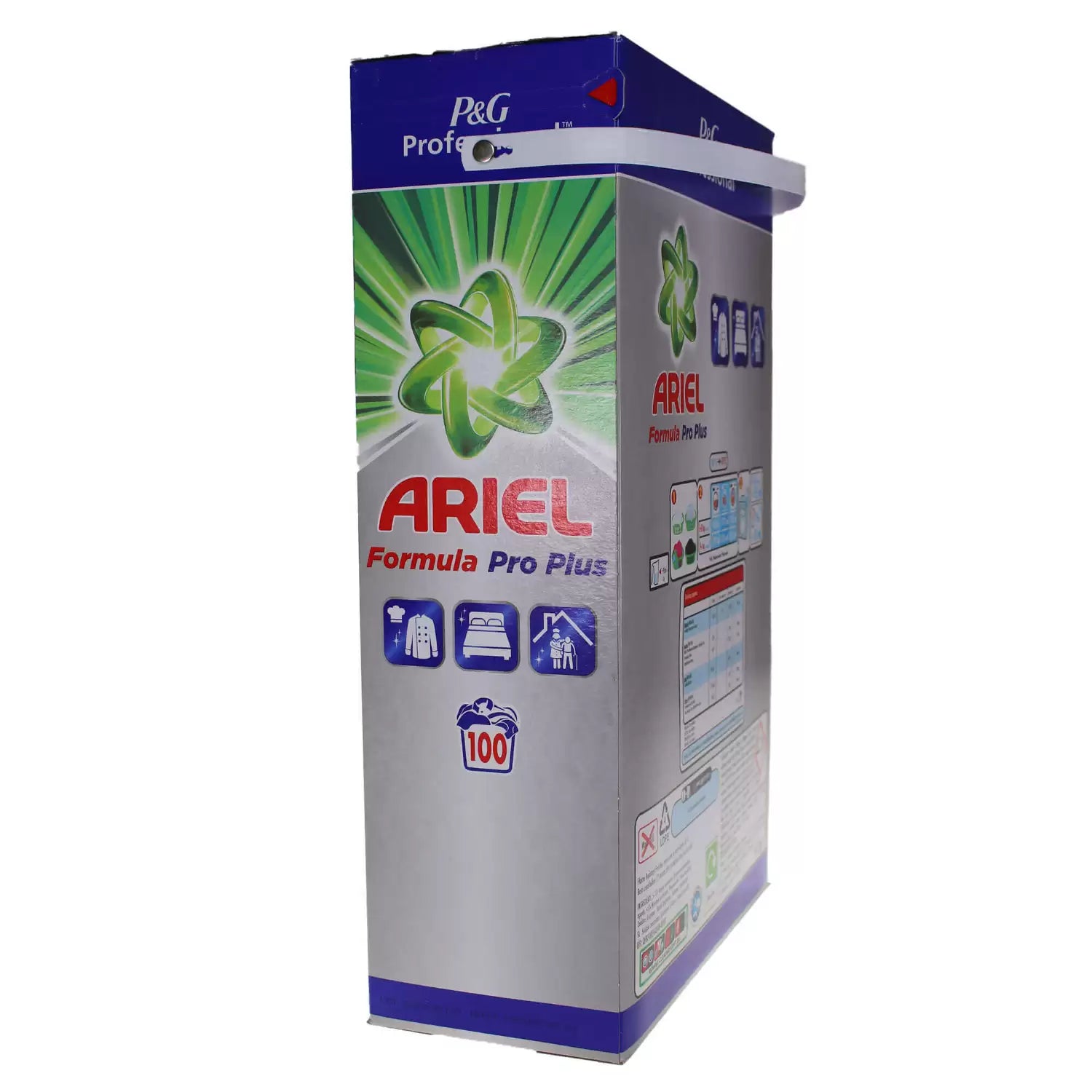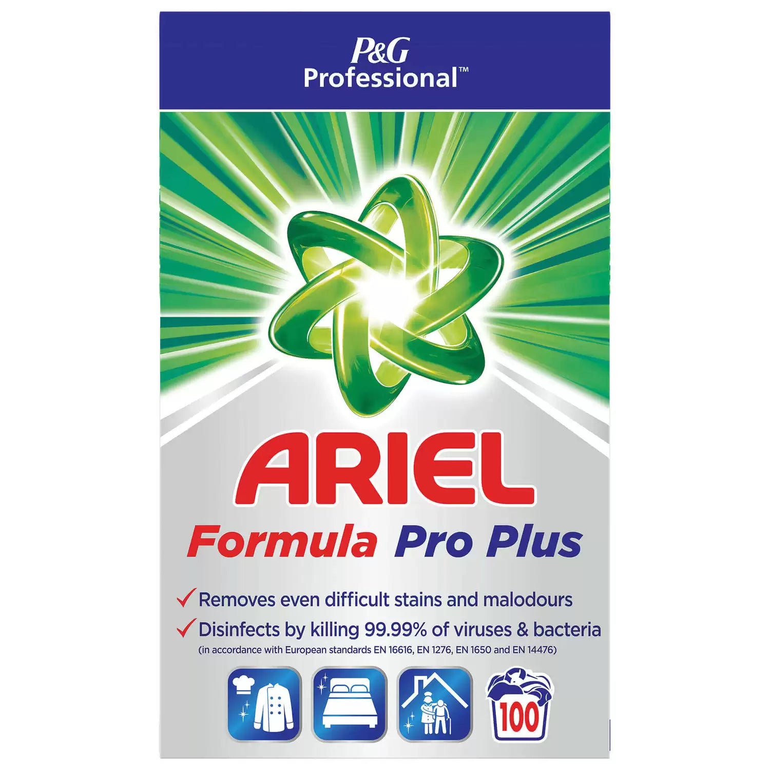 This massive 100 wash box of Ariel Professional Formula Pro Laundry Powder is formulated to remove difficult stains and malodours, utilising a powerful combination of ingredients. It disinfects by killing 99.99% of viruses and bacteria in accordance with EN 16616, EN 1276, EN 1650 and EN 14476. Each scoop gives a fresh but not overpowering scent. It provides great cleaning results without the need for pre-washing or pre-soaking, helping you save water and energy.