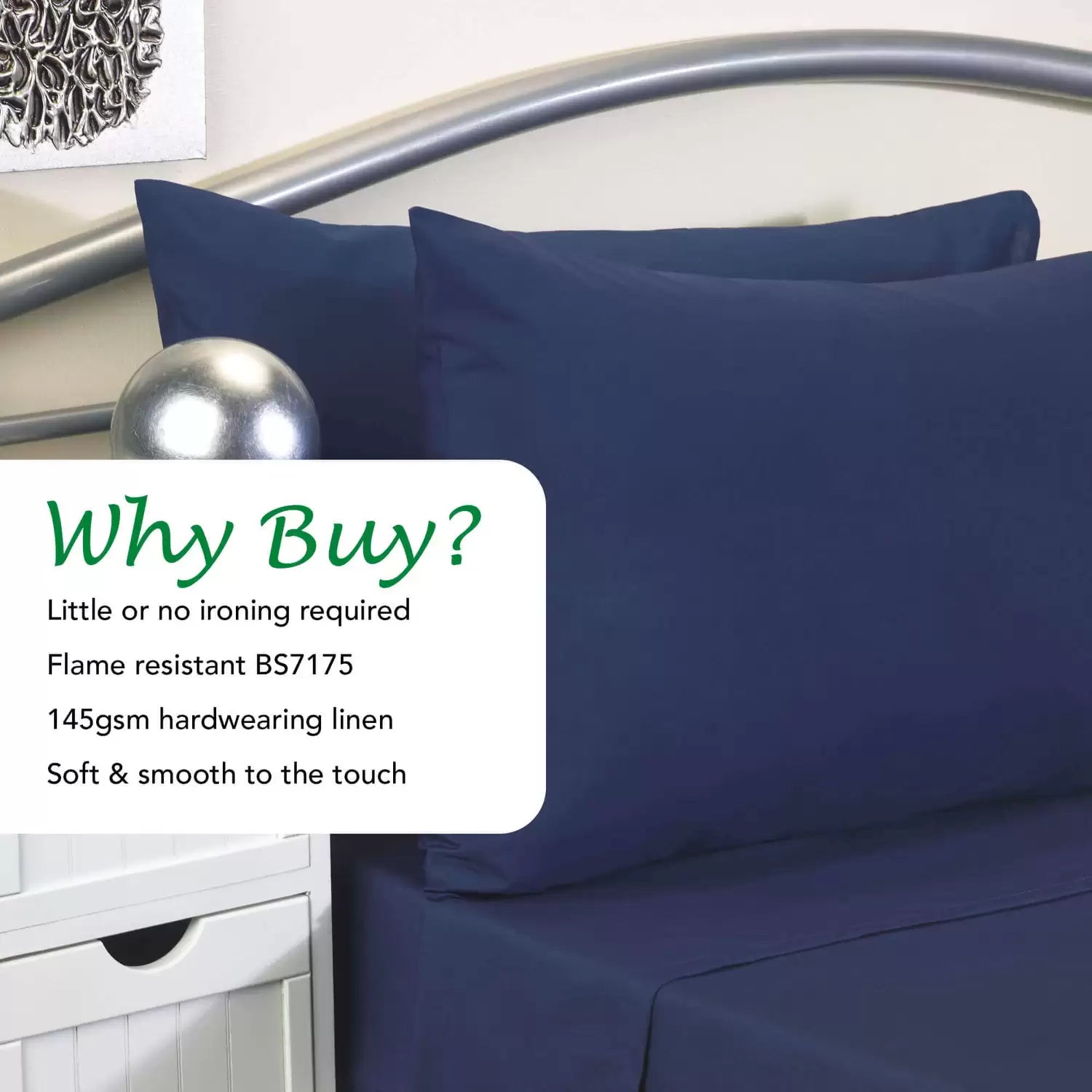 Our Fire Retardant Bedding Set Navy is certified to BS7175 Ignition Source 5+7, also known as Crib 7 or FR Source 7, making them ideal for care and nursing homes. Unlike other fabrics which have been treated with fire retardant coatings, our bedding set is inherently flame resistant and will remain so even after multiple washing at 71°c. At 145gsm it is hardwearing and durable, and requires little or no ironing, but feels soft, smooth and comfortable to the touch.