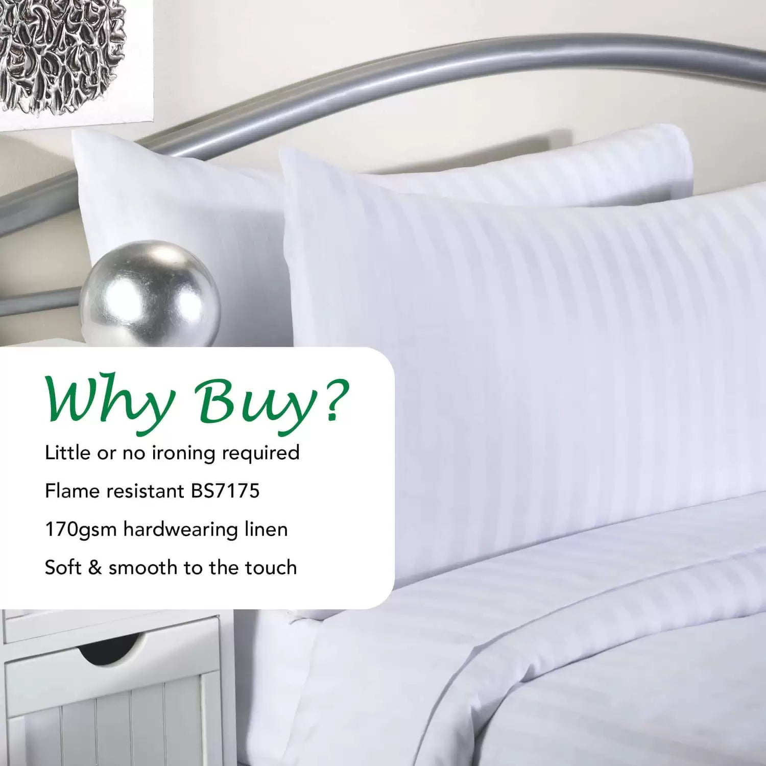 Enjoy hotel quality luxury with our Fire Retardant Satin Stripe Bedding Satin Stripe in classic white. Cleverly designed to look like satin stripe, this soft 170gsm bedlinen is in fact fully flame resistant to BS7515 Source 5+7, which means it will never wash out, even if you need to wash it at 70 degrees. It's also unbelievably easy to care for, needing minimal ironing to maintain its smooth good looks, and perfect for care and nursing homes.