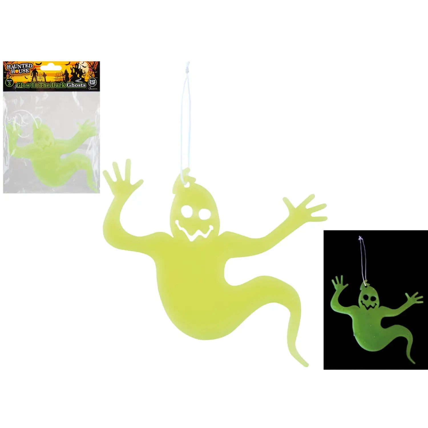 Give your Halloween decor an eerie glow with the Glow in the Dark Ghost Decorations 3 Pack! These spooky yet fun ghost figures absorb light and glows in the dark, adding a haunting effect to your party, haunted house, or trick-or-treat setup. Featuring a lightweight design and attached strings, they are easy to hang from ceilings, doorways, or walls. Perfect for creating a chilling yet playful atmosphere for any Halloween celebration!