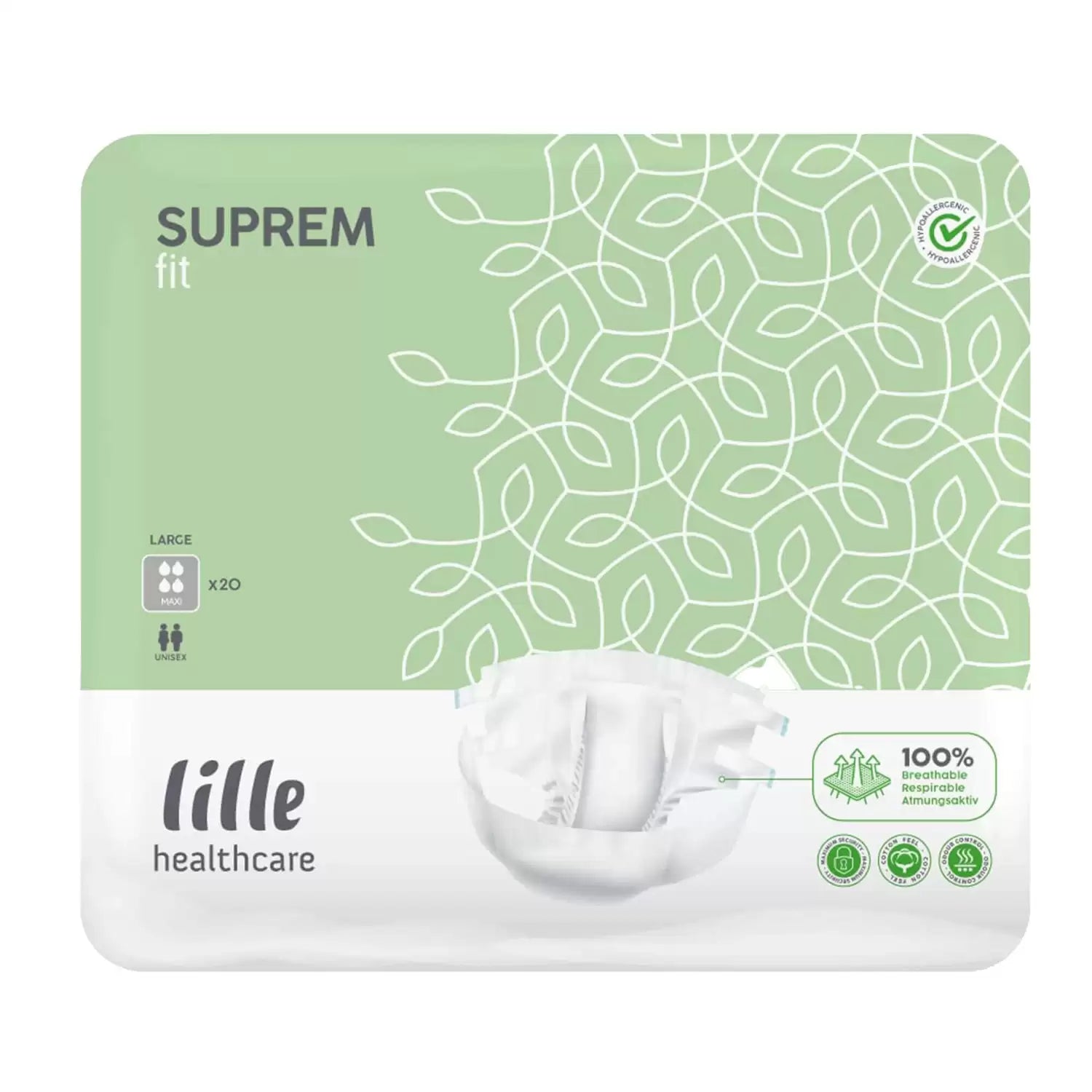 Suitable for most kinds of incontinence, the Lille SupremFit Maxi Large have a highly absorbent design. They have been manufactured to offer a rustle-free wear with a waterproof backing that prevents leaks and other accidents. The Stay Dry barrier helps to add further protection while the entire pad wicks away moisture to present sores or rubbing against the skin. They have been designed as an all in one pad and are available in a range of sizes to suit your personal needs. This pack of 20 all in ones comes individually wrapped for easy distribution and can be stored alongside the rest of your care home's incontinence supplies for when it is next required.