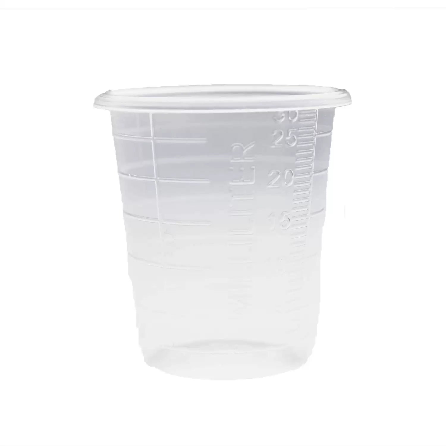 30ml plastic medicine measure, of clear polypropylene with 1ml minor graduations and 5ml major graduations