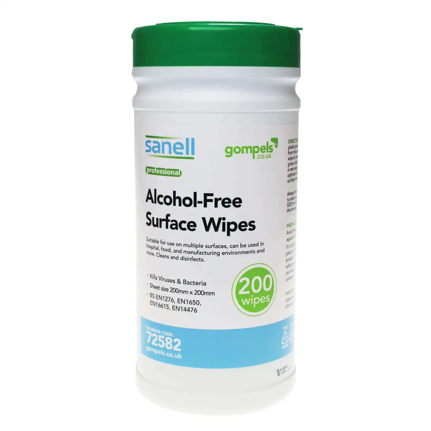 Our Alcohol Free Surface Wipes Tub from own brand Sanell contains 200 large wet wipes designed to disinfect and clean hard surfaces. Each sheet is dispensed through a convenient closable dispenser lid and is proven to kill 99.99% of bacteria and viruses. This handy pack has been expertly produced in the UK and conforms to the following standards: