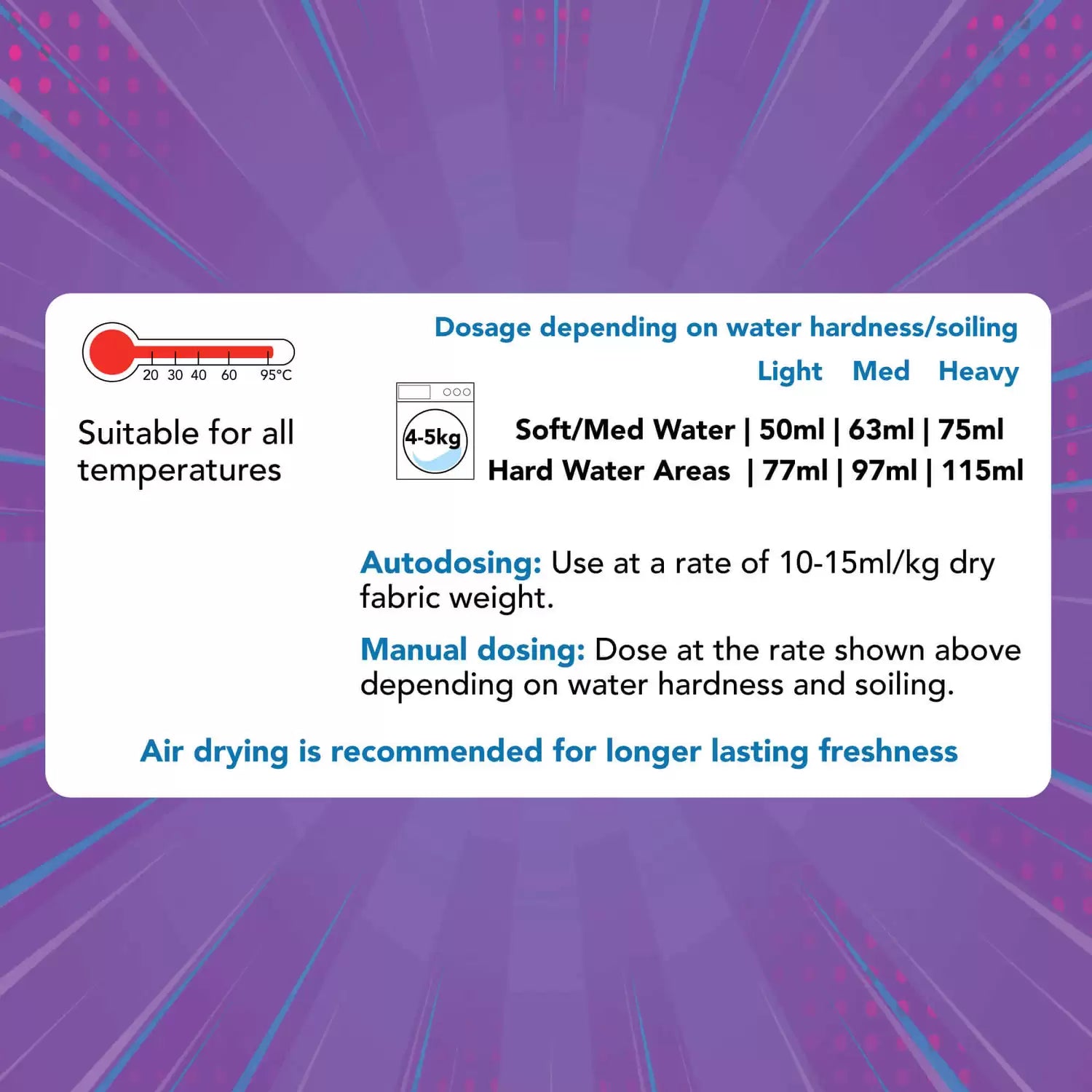 Our liquid Laundry Detergent has been specially formulated to be tough on stains and effective from 20 degrees Celsius. Its unique biological formulation with gentle but effective enzymes can remove heavy soiling with ease. The long lasting lavender aromas will make your linen and clothes smell fresh for days.