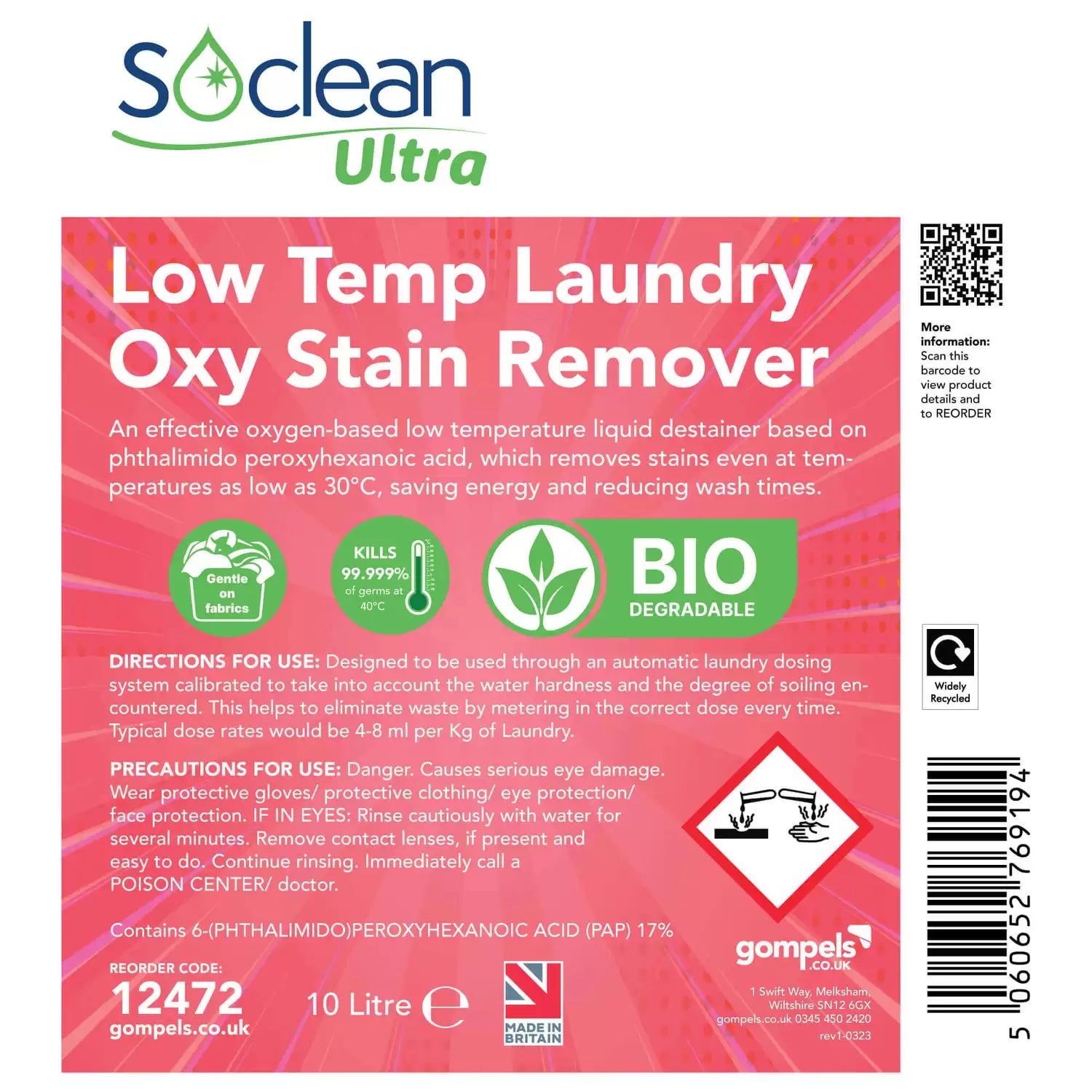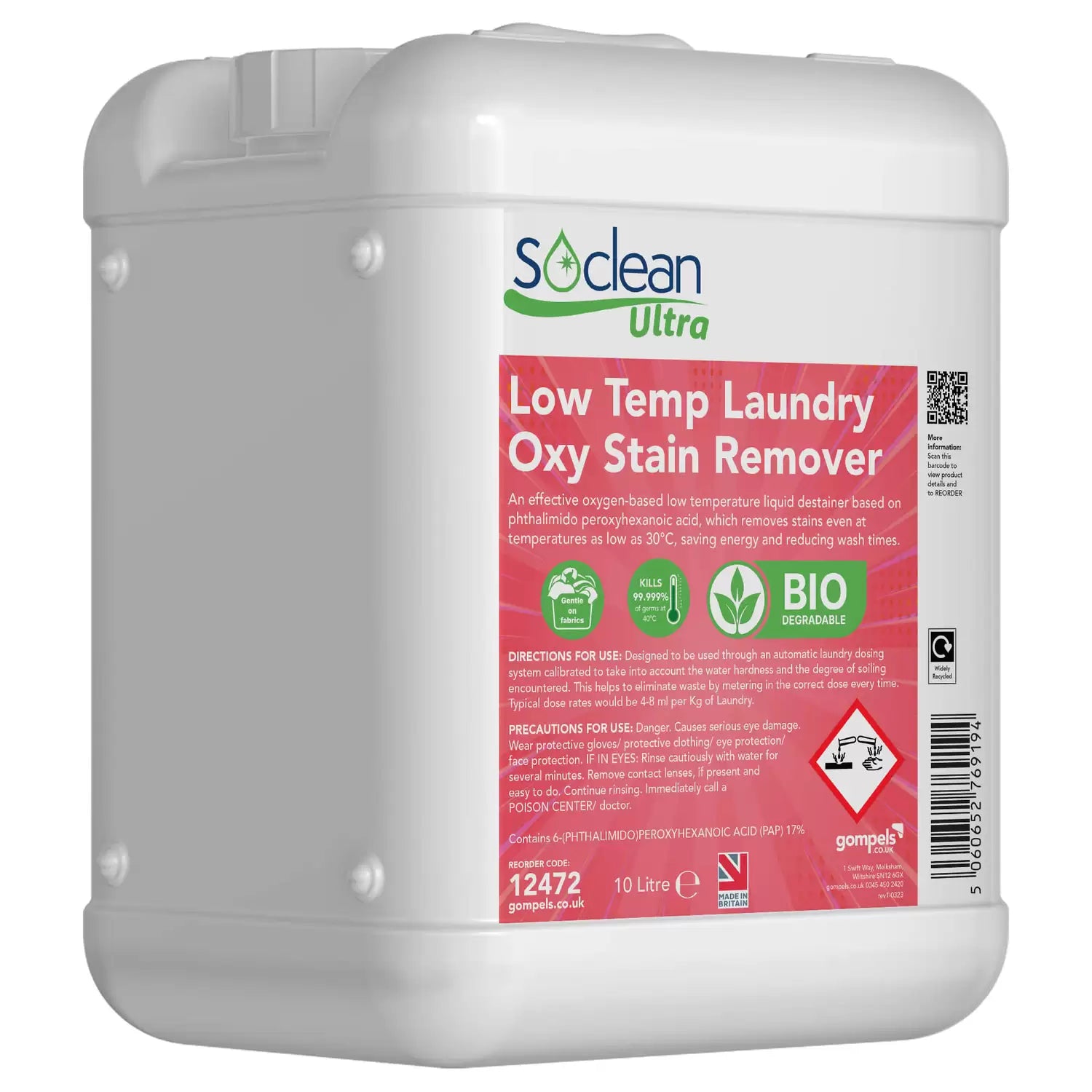 This Low Temp Laundry Oxy Stain Remover from own brand Soclean Ultra is designed to remove stains at temperatures as low as 30 degrees celsius. It is based on phthalimido peroxyhexanoic acid (PAP) which is highly effective, saving both energy and wash times. The formulation is gentle on fabrics and has been loved by nursing homes for many years. The broad antibacterial and fungicidal activity at 40 degrees makes it excellent for sluice washing.