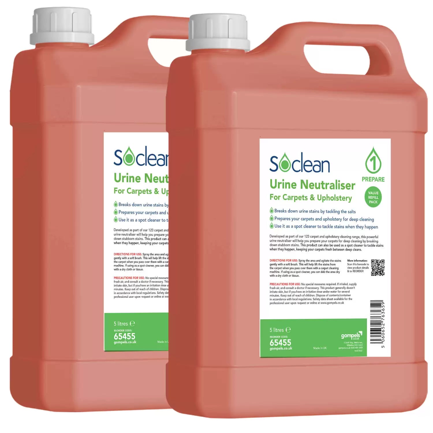 Our Soclean Urine Neutraliser eliminates unpleasant odours and can be sprayed onto stains found on both carpets and upholstery to help remove marks in a short period of time. The unique formula eats away at the crystals and salts to draw miscoloured marks away from fabrics. This neutraliser is suitable for use on human and pet urine along with vomit and comes in a large 5 litre bottle with easy grip handle and screw down lid.
