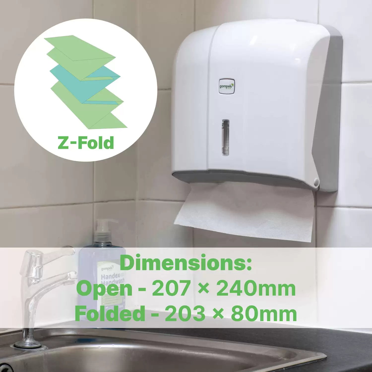 - Z-fold paper hand towels are a generous size and pull out of the dispenser individually, reducing costs.