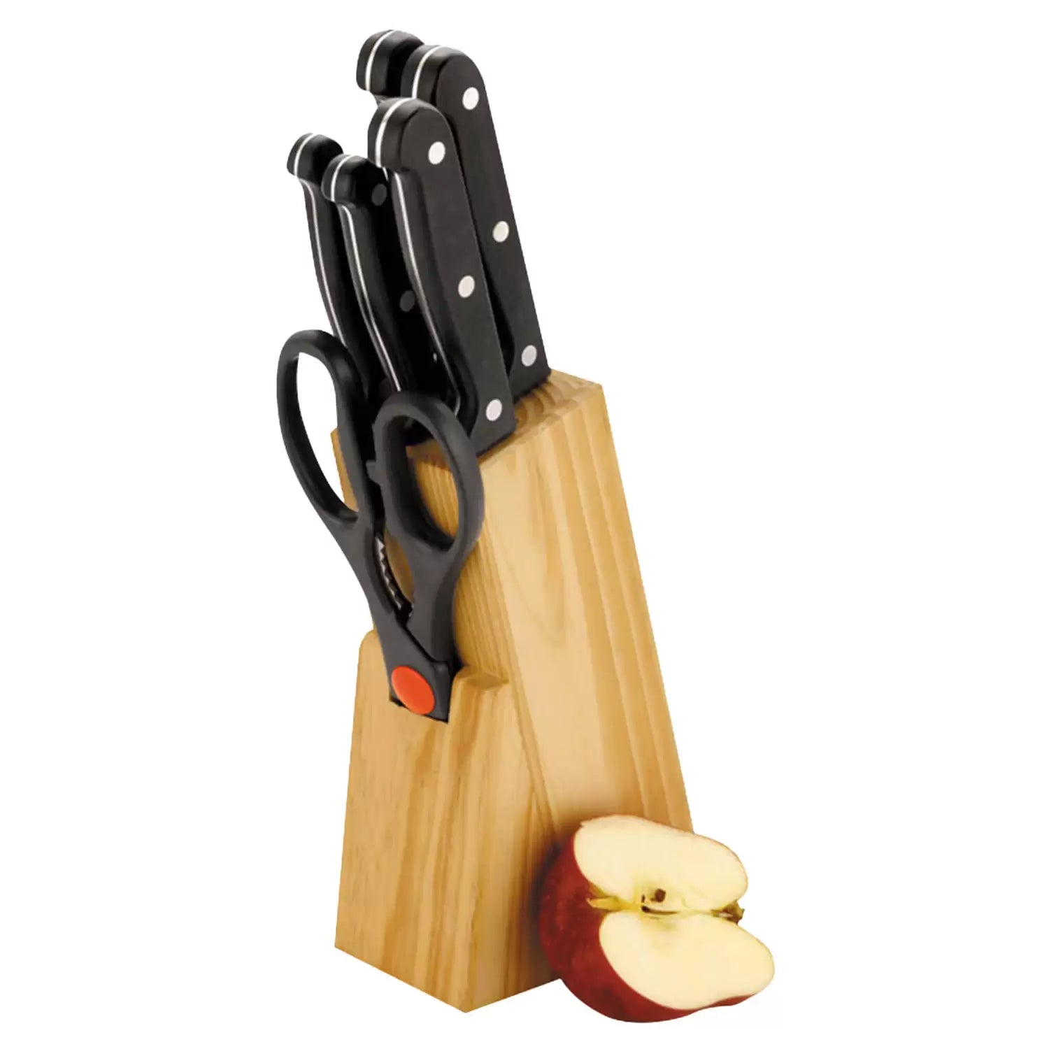 Our premium Wooden 5 Slot Knife Block has been meticulously crafted to elevate your culinary experience. With sleek Black Riveted handles, this set includes essential knives for every task: Boning, Carving, Cook's, Utility, Paring Knives, and a Pair of Scissors. The natural wooden block not only adds a touch of elegance to your kitchen but also ensures easy access and organisation for busy environments and professional kitchens alike. Elevate your culinary skills with this indispensable set designed for efficiency and durability.