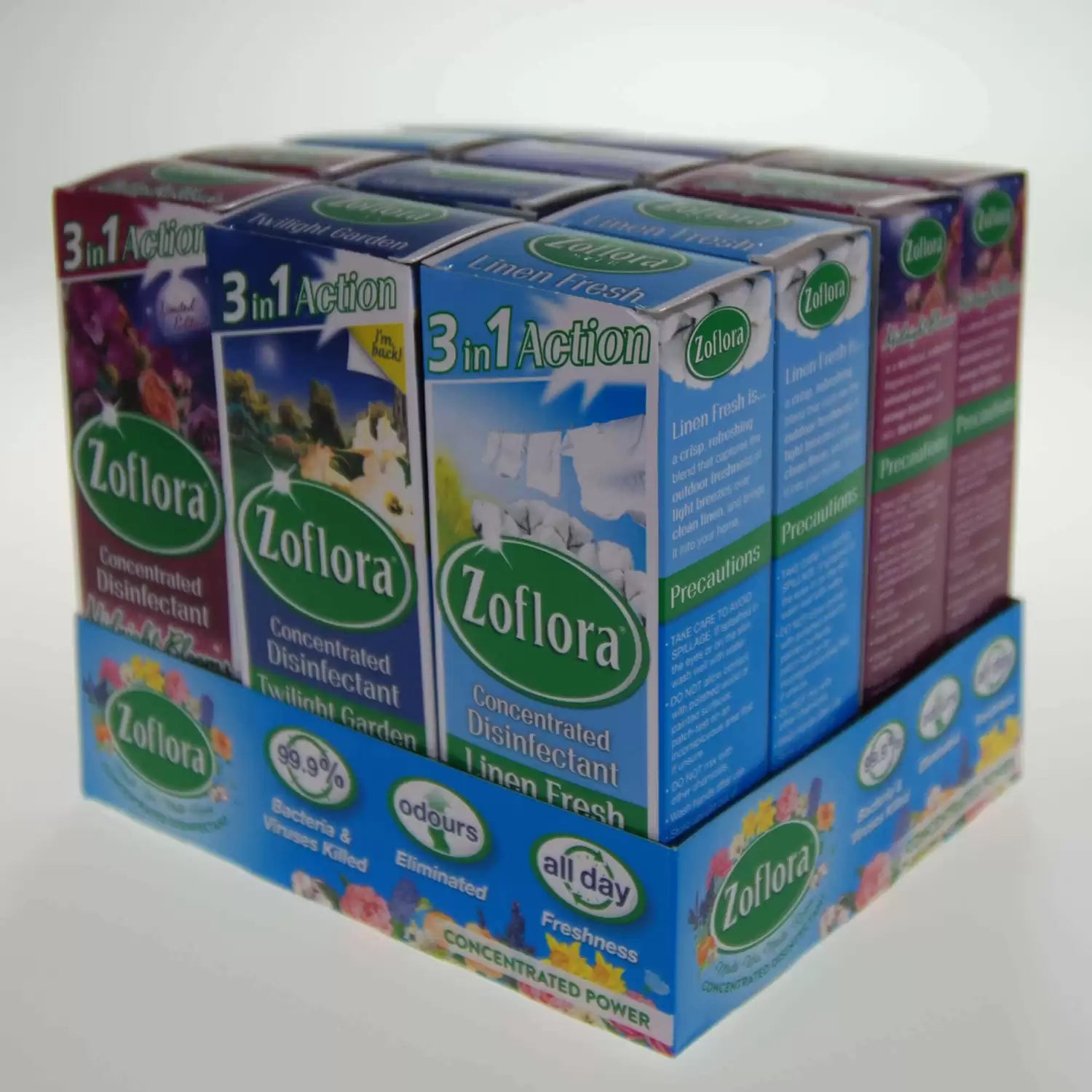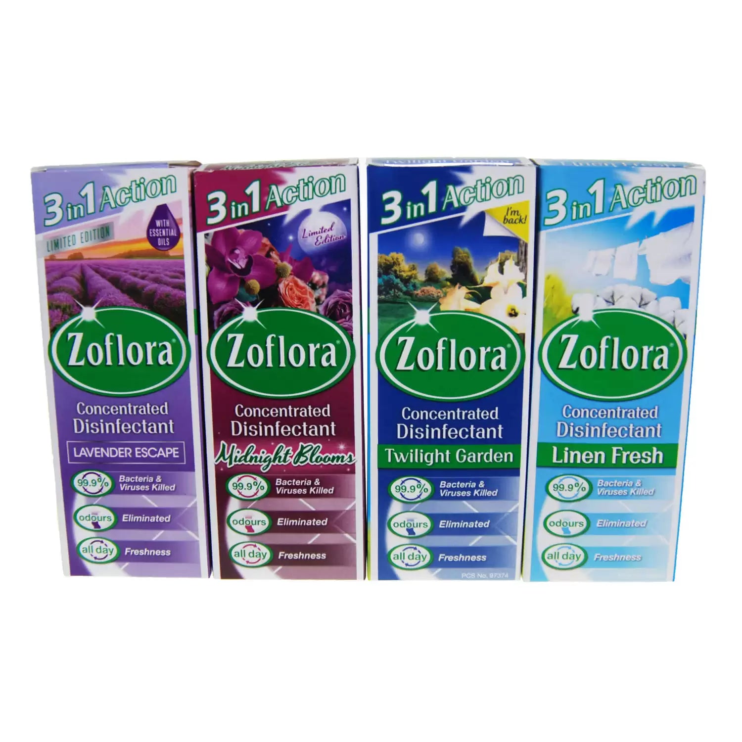 Our Zoflora Disinfectant Assortment will keep your workplace sparkling clean and smelling fresh. With a range of scents developed by perfume experts, Zoflora not only eliminates odours but kills bacteria and germs, leaving behind a long-lasting breath of fresh air. This concentrated disinfectant can be used neat or diluted in water on floors, baths, tiles, worktops, drains, toilets and more. To fight odours caused by bacteria in your drains, or toilet, use it straight from the bottle. When washing floors, 4 capfuls in a 1.5 litre bucket will clean away germs, bacteria and visible dirt. You can also make a DIY trigger spray by diluting 1.5 capfuls of Zoflora into a standard trigger spray bottle with water.